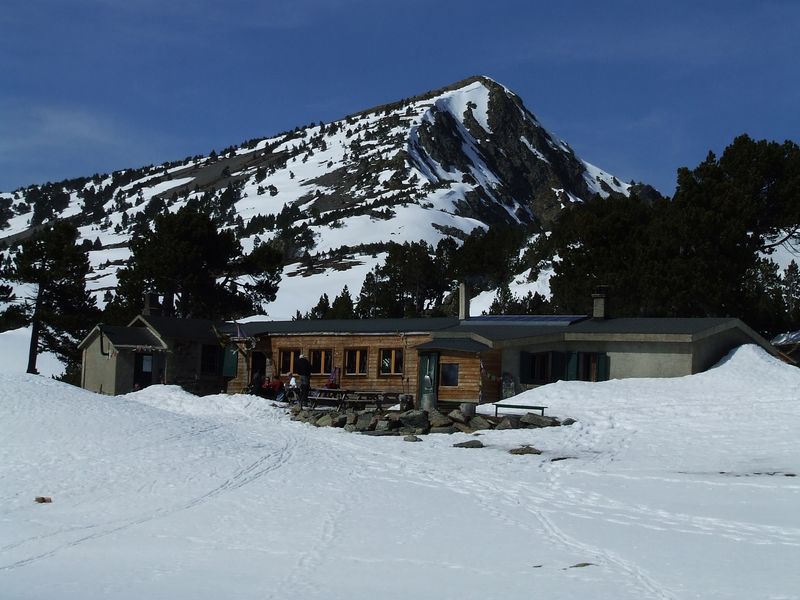 Le départ s’effectue depuis le parking de la station de Formiguères. Le forfait « randonneur » nous donne droit pour 7 euros à une montée, au sommet de la station à 2300m d'altitude, en utilisant 2 télésièges . Le télésiège de la ‘Calmasella’ nous dépose directement à 2100m. On choisit de monter les 200m restant en ski afin de conserver le bénéfice du télésiège ‘Serra de Mauri’ et ainsi se laisser la possibilité de descendre une jolie piste en neige damée.